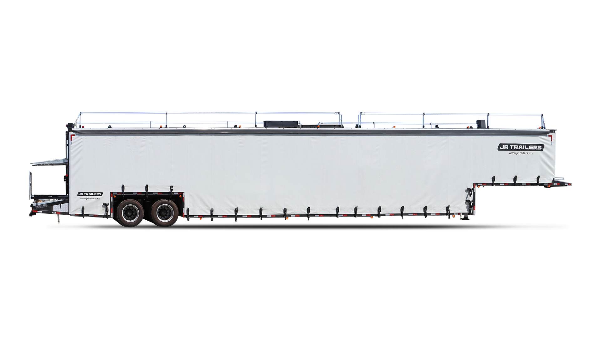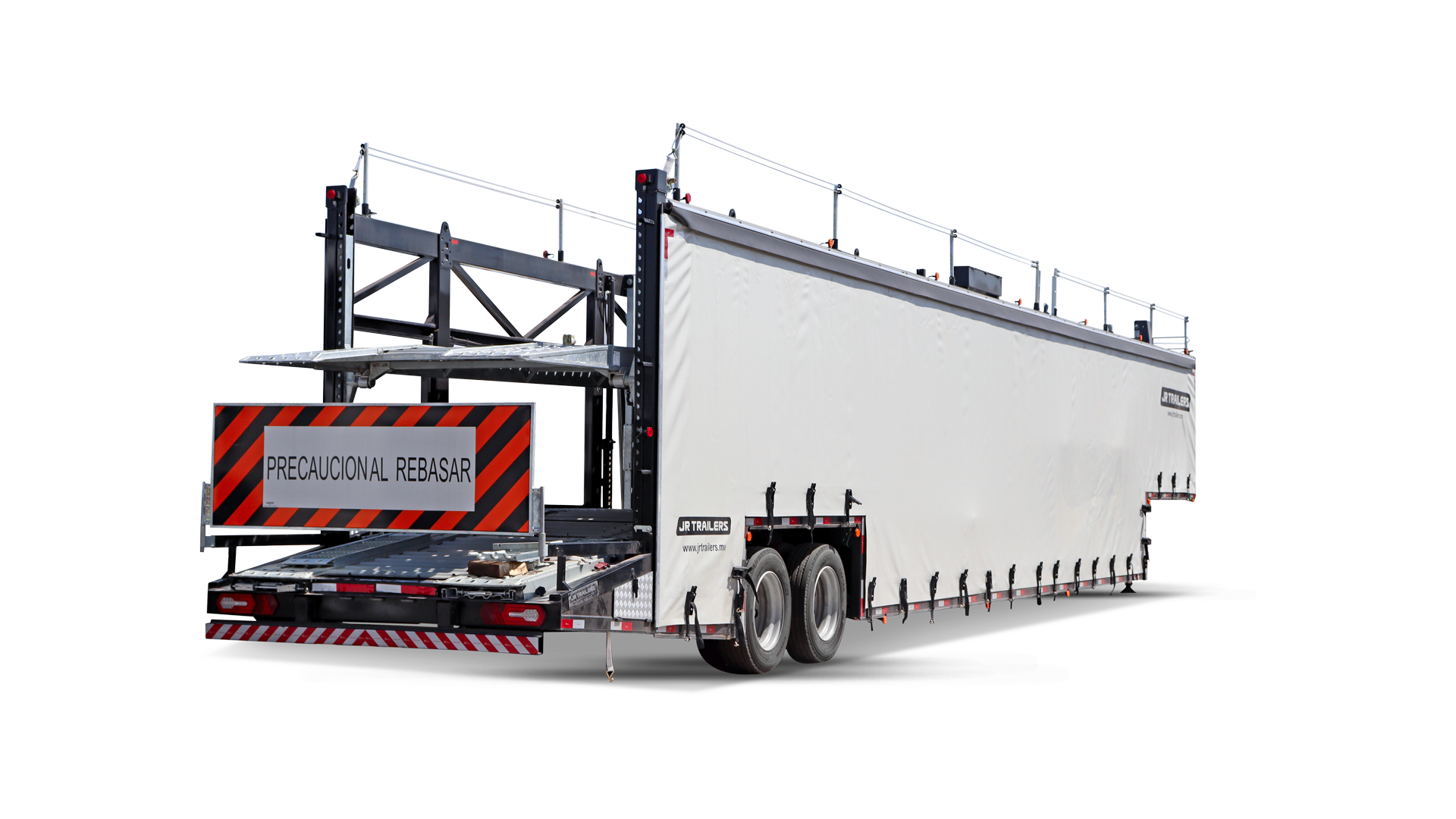 Nuestro Car Carrier Trailer 57´ es una unidad de transporte especializado de gran capacidad, diseñada para el traslado seguro de hasta 8 vehículos tipo sedán o hasta 10 city cars. Con una robusta estructura principal de acero al carbón, este remolque ofrece una carga útil de 29,100 kg, garantizando resistencia y estabilidad en cada trayecto.